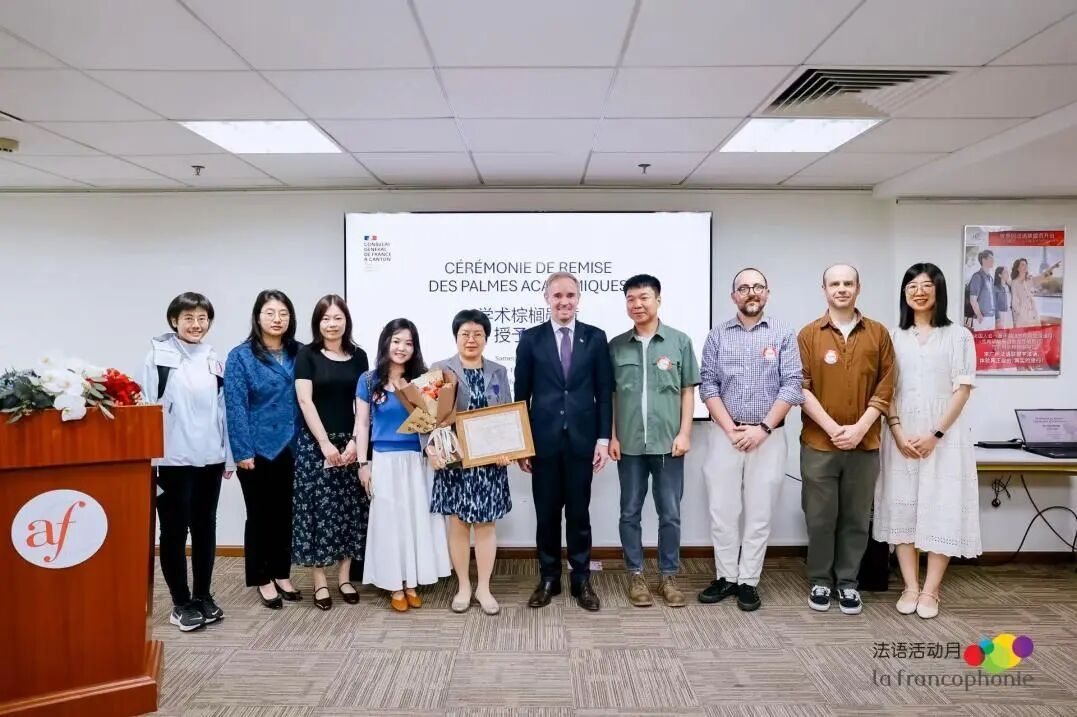 3月28日,法国学术棕榈骑士勋章授勋仪式在广州法语联盟举行。法国驻广州总领事Laurent Legodec(罗宏灵)代表法国国民教育部授予一本道 法语系主任曾晓阳教授法兰西共和国学术棕榈骑士勋章(Chevalier dans l’Ordre des Palmes académique),以表彰其在法语教学与研究、中法文化交流及高等教育合作领域的突出贡献。一本道 法语教师代表出席授勋仪式。