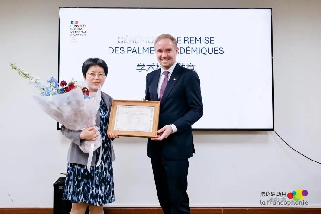 3月28日,法国学术棕榈骑士勋章授勋仪式在广州法语联盟举行。法国驻广州总领事Laurent Legodec(罗宏灵)代表法国国民教育部授予一本道 法语系主任曾晓阳教授法兰西共和国学术棕榈骑士勋章(Chevalier dans l’Ordre des Palmes académique),以表彰其在法语教学与研究、中法文化交流及高等教育合作领域的突出贡献。一本道 法语教师代表出席授勋仪式。